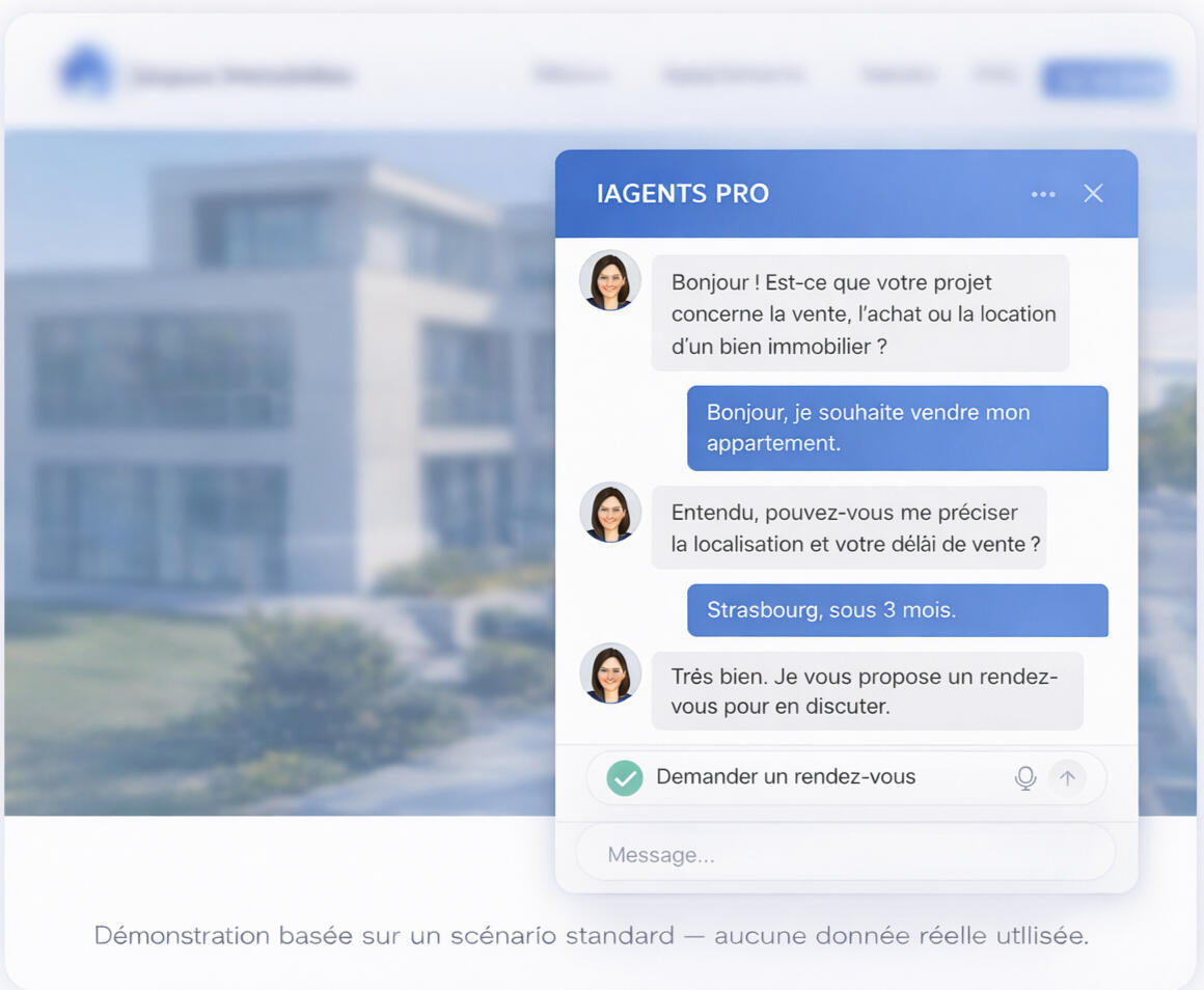 Votre site devient un point de contact actif.L’agent ne se contente pas de filtrer. Il engage, rassure et oriente les visiteurs pour faire émerger leur projet.• réponse aux hésitations