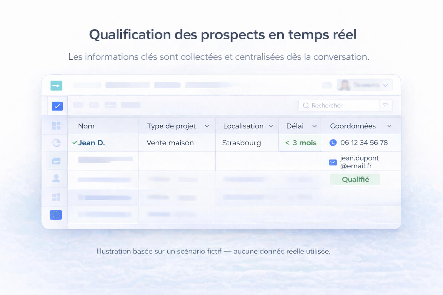 et collecte les informations essentielles dès la première conversation.Vous récupérez des prospects qualifiés, structurés et prêts à être contactés :